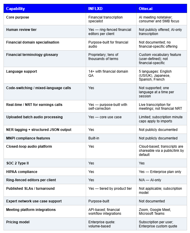 Otter produces meeting summaries, action items, and searchable transcripts — output designed for team follow-up. INFLXD produces structured, human-reviewed transcripts with named entity recognition, speaker labels validated by financial editors, word-level timestamps for audio snippet retrieval, and JSON-ready structured data for knowledge platforms, RAG pipelines, and AI search interfaces. The output from Otter.ai cannot be used as a drop-in replacement for production financial transcription without significant internal processing — which eliminates the cost advantage the lower subscription price appears to offer.