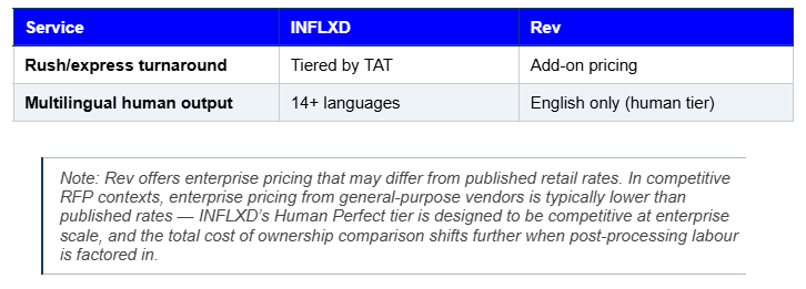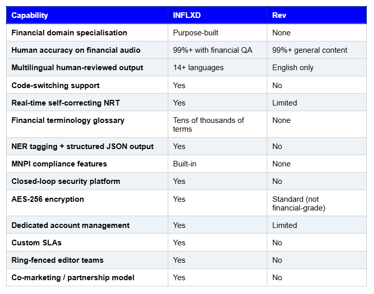 Rev offers AI transcription in 37+ languages and global subtitles translating English video into 15+ languages, but their human transcription service is English-only. For compliance-sensitive financial content requiring human-reviewed accuracy in non-English languages, organisations currently need to source a separate solution. INFLXD supports 14+ languages with human-reviewed transcription, eliminating that fragmentation.