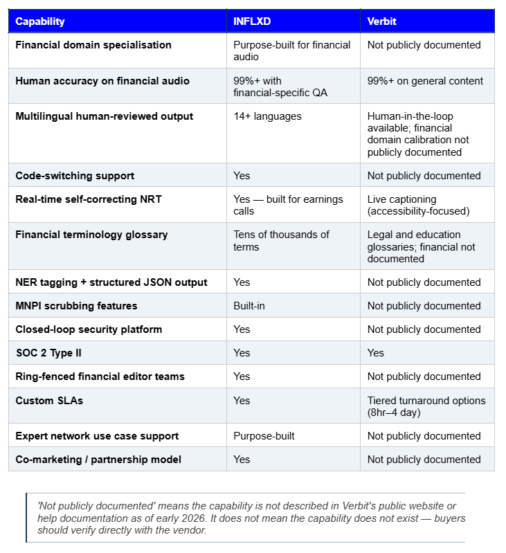 The distinction matters, because the two are genuinely different products. Verbit is a well-regarded accessibility platform. INFLXD is a purpose-built financial transcription platform. Understanding which one your workflow actually needs is the point of this page.